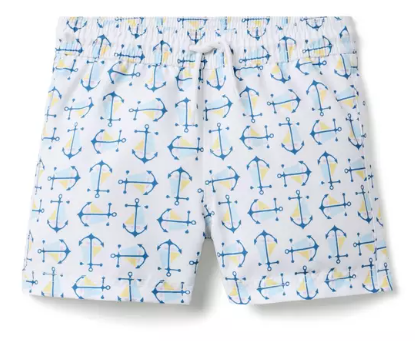 - Set sail for sunny days with our anchor print swim trunk. With UPF 50+ sun protection, a touch-close back pocket and embroidered eyelets to let water drain out. Responsibly made with recycled fabric.
