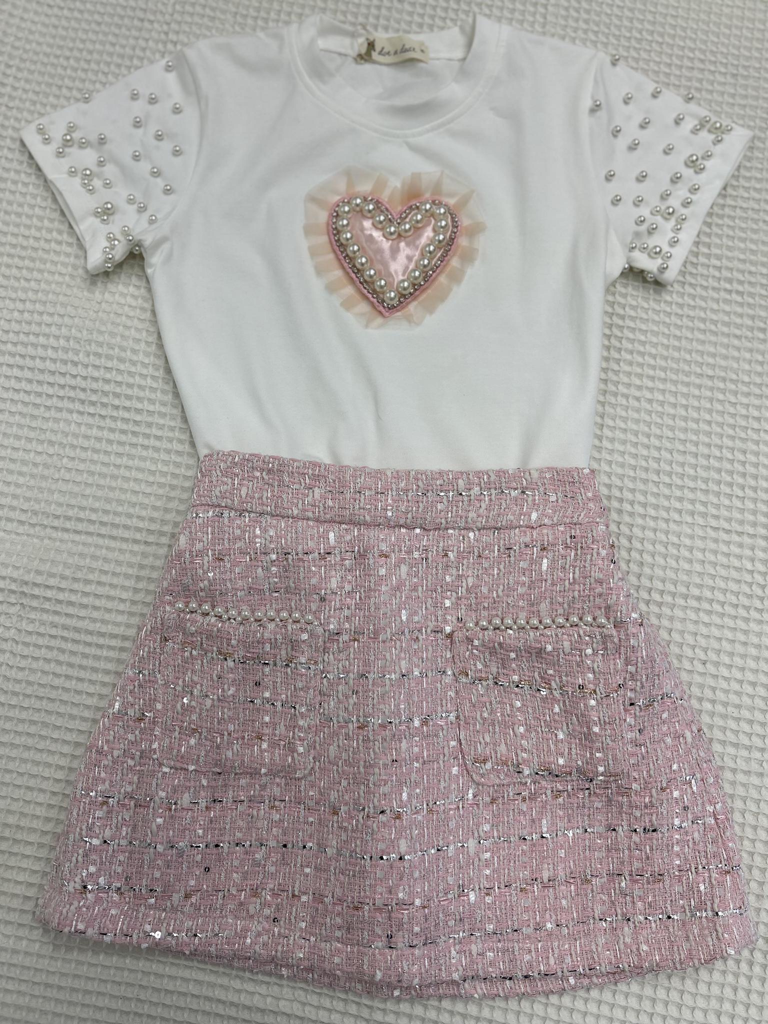 This cute classic tee is perfect for your little sweetheart with its adorable pink mesh pearl trimmed heart and elegant pearl sleeves! Paired with a pink tweed skirt that offers effortless sophistication with its pearl trimmed pockets. Crafted from tweed, this skirt features an elastic waistband.