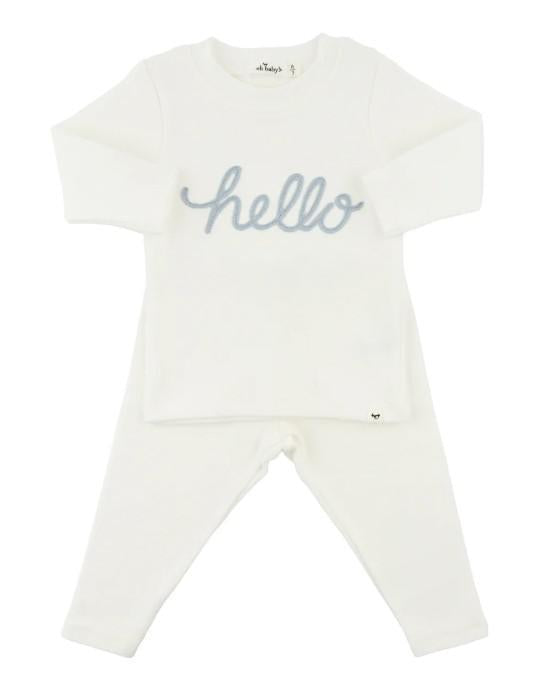 Surprise your loved ones with this playful, oh-so-cute two piece set! Perfect for revealing your pregnancy or bringing baby home in style. The long sleeve tee features a fog blue embroidered "hello", while the coordinating pants complete the look. Keep your little one stylish and comfortable in this ensemble.