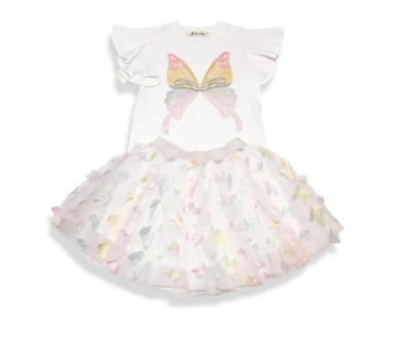 A fun take on a classic tee, this shirt is magical with a beautifully detailed butterfly! The sleeves are elegant flutter sleeves for a casual and elevated look. Come with a 3-D matching tutu.